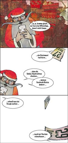 Frohe Weihnachten und ein gutes neues Jahr! Tja, so kann es gehen, wenn der Weihnachtsmann vor lauter googlen, whatsappen, twittern, posten und surfen die Zeit vergisst. Wer dann wohl die ganzen Päckchen austrägt? In diesem Sinne: Aufhören. Jetzt. Baum schmücken. Und dann: Ende Gelände. |